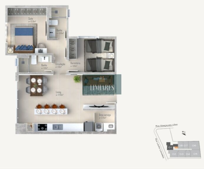 Os espaços comuns são elegantes e funcionais: salão de festas, academia e hall de entrada, todos mobiliados, climatizados e prontos para uso.